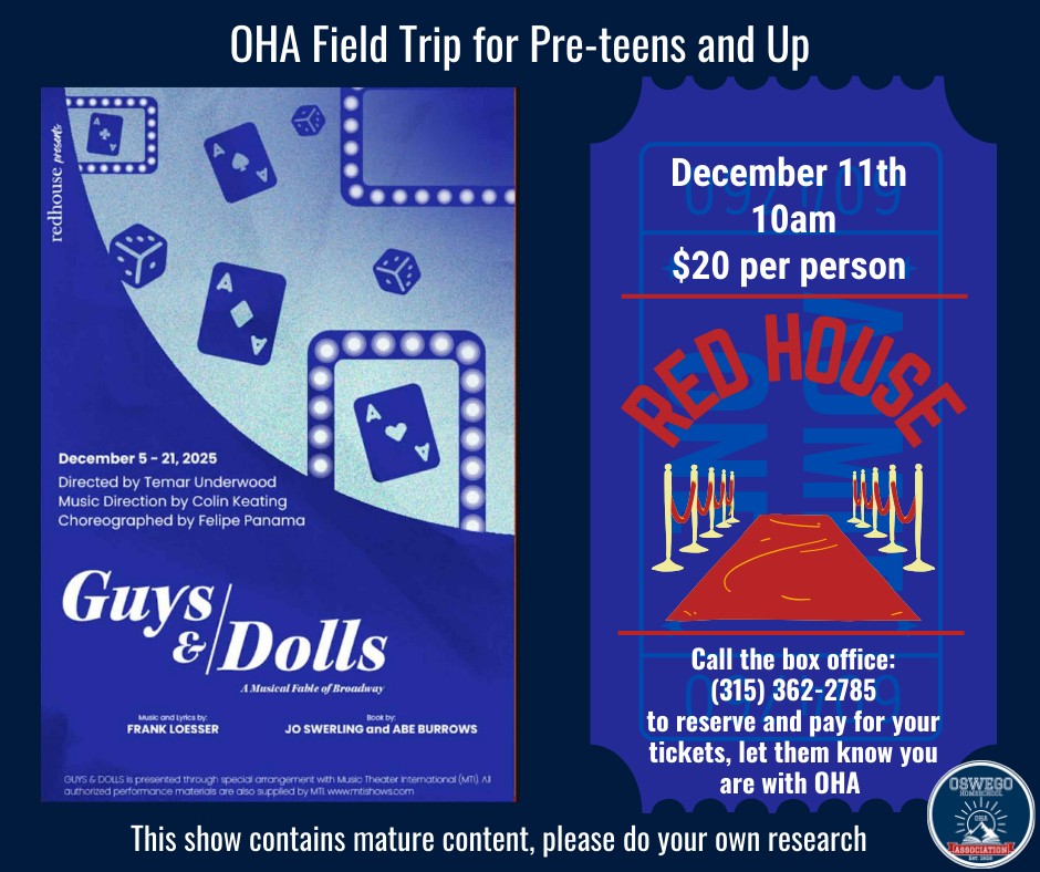 Call the box office (315) 362-2785 to reserve and pay for your tickets, let them know you are with OHA