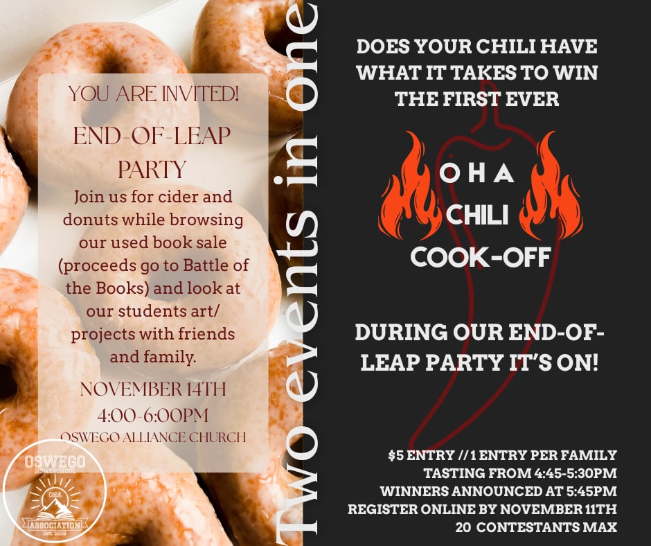Chili cookoff!! $5 entry fee. Participants must bring their (already cooked) chili in a crock pot/instant pot. Ingredient lists must be posted / hardcopies available for allergy reasons. Two judging categories: Adults and Kids. Judging 4:45-5:30ish. Winners announced at 5:45.